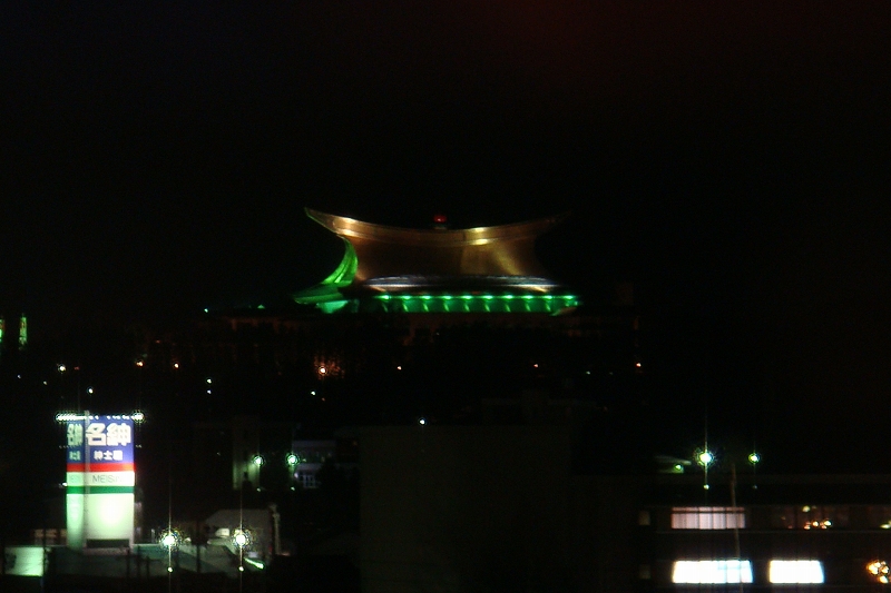 高山の夜に浮かび上がる、某宗教団体の本部。